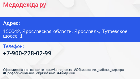 Медодежда.ру по адресу 150042, Ярославская область, Ярославль, Тутаевское шоссе, 1 в дальнейшем Организация, размещена в следующих категориях: