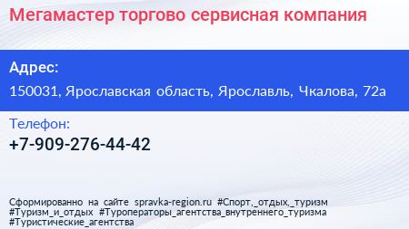 Мегамастер, торгово-сервисная компания по адресу 150031, Ярославская область, Ярославль, Чкалова, 72а в дальнейшем Организация, размещена в следующих категориях: