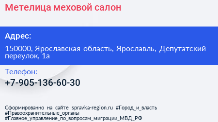 Метелица, меховой салон по адресу 150000, Ярославская область, Ярославль, Депутатский переулок, 1а в дальнейшем Организация, размещена в следующих категориях: