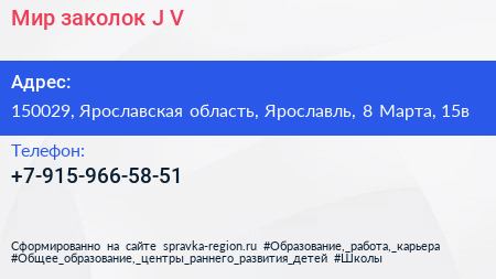 Мир заколок J & V по адресу 150029, Ярославская область, Ярославль, 8 Марта, 15в в дальнейшем Организация, размещена в следующих категориях: