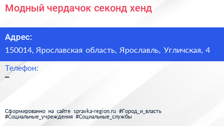 Модный чердачок, секонд-хенд по адресу 150014, Ярославская область, Ярославль, Угличская, 4 в дальнейшем Организация, размещена в следующих категориях: