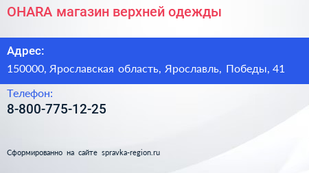 OHARA, магазин верхней одежды по адресу 150000, Ярославская область, Ярославль, Победы, 41 в дальнейшем Организация, размещена в следующих категориях: