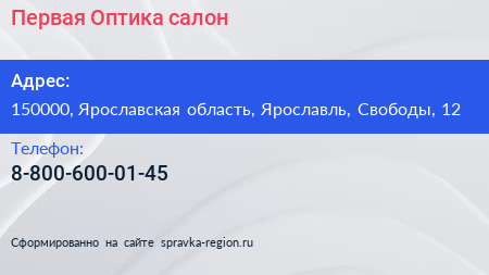 Первая Оптика, салон по адресу 150000, Ярославская область, Ярославль, Свободы, 12 в дальнейшем Организация, размещена в следующих категориях: