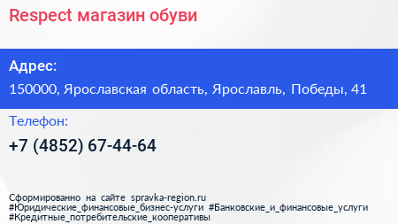 Respect, магазин обуви по адресу 150000, Ярославская область, Ярославль, Победы, 41 в дальнейшем Организация, размещена в следующих категориях:
