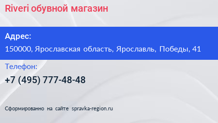 Riveri, обувной магазин по адресу 150000, Ярославская область, Ярославль, Победы, 41 в дальнейшем Организация, размещена в следующих категориях: