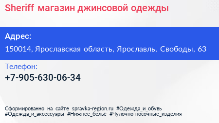 Sheriff, магазин джинсовой одежды по адресу 150014, Ярославская область, Ярославль, Свободы, 63 в дальнейшем Организация, размещена в следующих категориях: