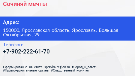 Сочиняй мечты по адресу 150000, Ярославская область, Ярославль, Большая Октябрьская, 29 в дальнейшем Организация, размещена в следующих категориях: