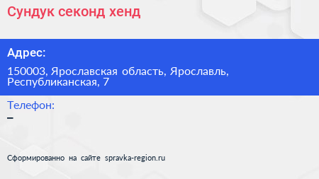 Сундук, секонд-хенд по адресу 150003, Ярославская область, Ярославль, Республиканская, 7 в дальнейшем Организация, размещена в следующих категориях: