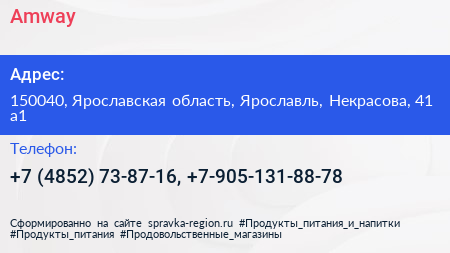 Amway по адресу 150040, Ярославская область, Ярославль, Некрасова, 41 а1 в дальнейшем Организация, размещена в следующих категориях: