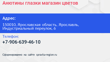 Анютины глазки, магазин цветов по адресу 150010, Ярославская область, Ярославль, Индустриальный переулок, 6 в дальнейшем Организация, размещена в следующих категориях: