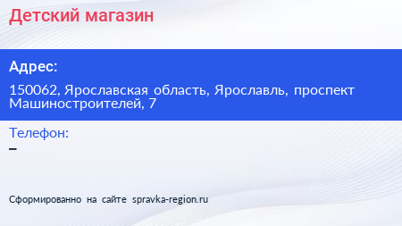 Детский магазин по адресу 150062, Ярославская область, Ярославль, проспект Машиностроителей, 7 в дальнейшем Организация, размещена в следующих категориях:
