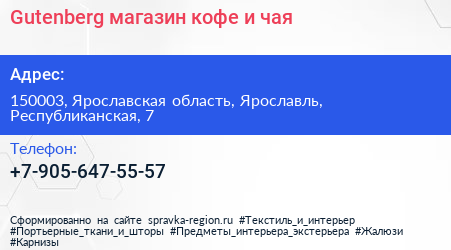 Gutenberg, магазин кофе и чая по адресу 150003, Ярославская область, Ярославль, Республиканская, 7 в дальнейшем Организация, размещена в следующих категориях: