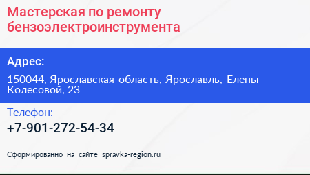 Мастерская по ремонту бензоэлектроинструмента по адресу 150044, Ярославская область, Ярославль, Елены Колесовой, 23 в дальнейшем Организация, размещена в следующих категориях: