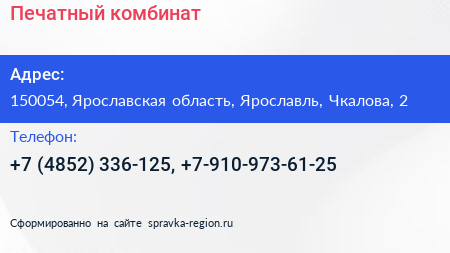 Печатный комбинат по адресу 150054, Ярославская область, Ярославль, Чкалова, 2 в дальнейшем Организация, размещена в следующих категориях: