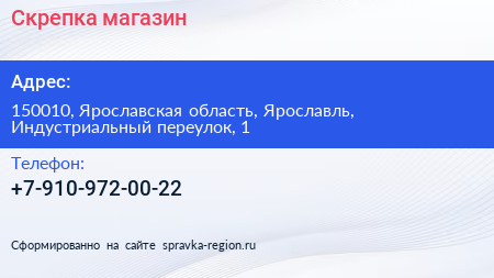 Скрепка, магазин по адресу 150010, Ярославская область, Ярославль, Индустриальный переулок, 1 в дальнейшем Организация, размещена в следующих категориях: