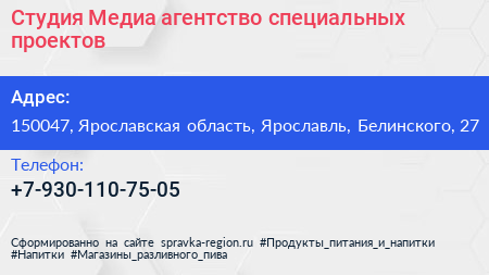 Студия Медиа, агентство специальных проектов по адресу 150047, Ярославская область, Ярославль, Белинского, 27 в дальнейшем Организация, размещена в следующих категориях: