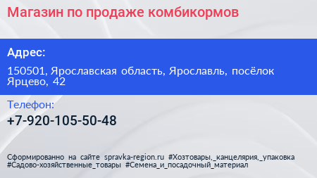 Магазин по продаже комбикормов по адресу 150501, Ярославская область, Ярославль, посёлок Ярцево, 42 в дальнейшем Организация, размещена в следующих категориях: