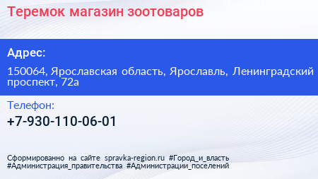 Теремок, магазин зоотоваров по адресу 150064, Ярославская область, Ярославль, Ленинградский проспект, 72а в дальнейшем Организация, размещена в следующих категориях: