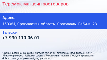 Теремок, магазин зоотоваров по адресу 150064, Ярославская область, Ярославль, Бабича, 28 в дальнейшем Организация, размещена в следующих категориях: