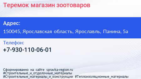 Теремок, магазин зоотоваров по адресу 150045, Ярославская область, Ярославль, Панина, 5а в дальнейшем Организация, размещена в следующих категориях:
