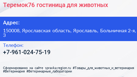 Теремок76, гостиница для животных по адресу 150008, Ярославская область, Ярославль, Больничная 2-я, 3 в дальнейшем Организация, размещена в следующих категориях: