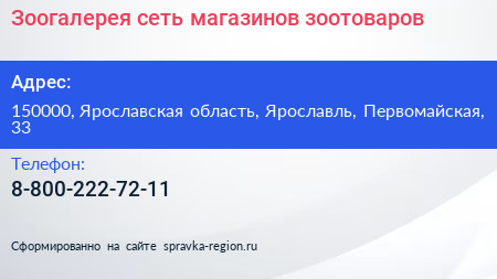 Зоогалерея, сеть магазинов зоотоваров по адресу 150000, Ярославская область, Ярославль, Первомайская, 33 в дальнейшем Организация, размещена в следующих категориях: