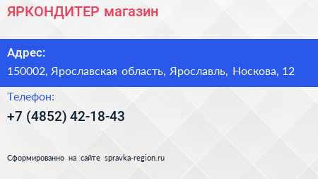 ЯРКОНДИТЕР, магазин по адресу 150002, Ярославская область, Ярославль, Носкова, 12 в дальнейшем Организация, размещена в следующих категориях: