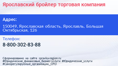 Ярославский бройлер, торговая компания по адресу 150049, Ярославская область, Ярославль, Большая Октябрьская, 126 в дальнейшем Организация, размещена в следующих категориях: