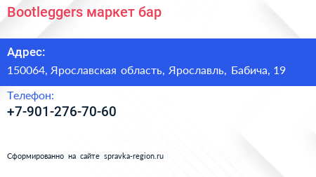 Bootleggers, маркет-бар по адресу 150064, Ярославская область, Ярославль, Бабича, 19 в дальнейшем Организация, размещена в следующих категориях: