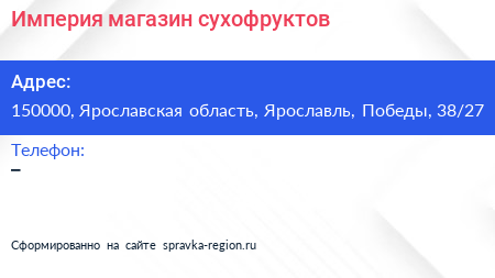 Империя, магазин сухофруктов по адресу 150000, Ярославская область, Ярославль, Победы, 38/27 в дальнейшем Организация, размещена в следующих категориях: