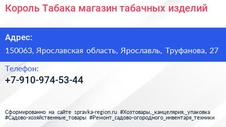 Король Табака, магазин табачных изделий по адресу 150063, Ярославская область, Ярославль, Труфанова, 27 в дальнейшем Организация, размещена в следующих категориях: