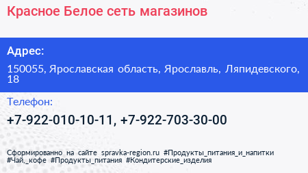 Красное & Белое, сеть магазинов по адресу 150055, Ярославская область, Ярославль, Ляпидевского, 18 в дальнейшем Организация, размещена в следующих категориях:
