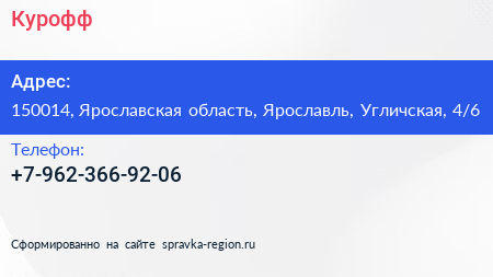 Курофф по адресу 150014, Ярославская область, Ярославль, Угличская, 4/6 в дальнейшем Организация, размещена в следующих категориях: