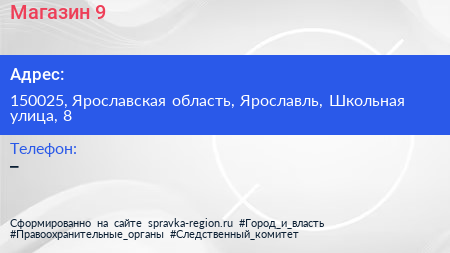 Магазин № 9 по адресу 150025, Ярославская область, Ярославль, Школьная улица, 8 в дальнейшем Организация, размещена в следующих категориях: