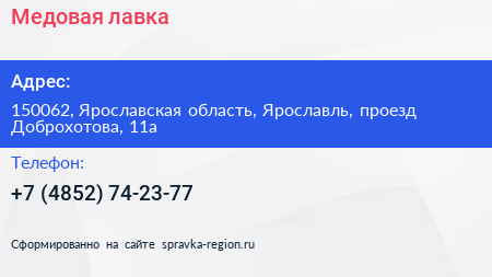 Медовая лавка по адресу 150062, Ярославская область, Ярославль, проезд Доброхотова, 11а в дальнейшем Организация, размещена в следующих категориях: