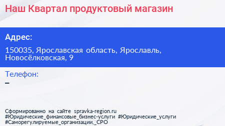 Наш Квартал, продуктовый магазин по адресу 150035, Ярославская область, Ярославль, Новосёлковская, 9 в дальнейшем Организация, размещена в следующих категориях:
