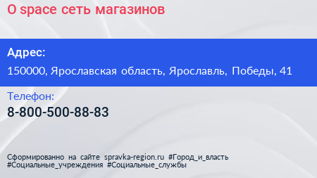 O: spaсe, сеть магазинов по адресу 150000, Ярославская область, Ярославль, Победы, 41 в дальнейшем Организация, размещена в следующих категориях: