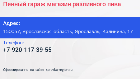 Пенный гараж, магазин разливного пива по адресу 150057, Ярославская область, Ярославль, Калинина, 17 в дальнейшем Организация, размещена в следующих категориях:
