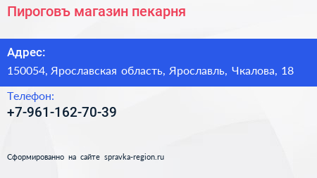 Пироговъ, магазин-пекарня по адресу 150054, Ярославская область, Ярославль, Чкалова, 18 в дальнейшем Организация, размещена в следующих категориях:
