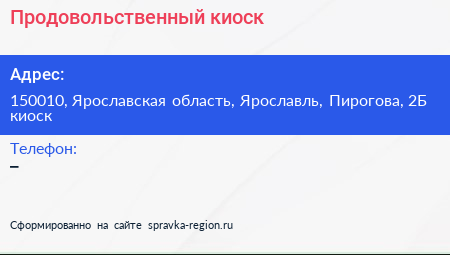 Продовольственный киоск по адресу 150010, Ярославская область, Ярославль, Пирогова, 2Б киоск в дальнейшем Организация, размещена в следующих категориях: