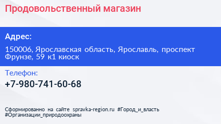 Продовольственный магазин по адресу 150006, Ярославская область, Ярославль, проспект Фрунзе, 59 к1 киоск в дальнейшем Организация, размещена в следующих категориях: