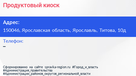 Продуктовый киоск по адресу 150046, Ярославская область, Ярославль, Титова, 10д в дальнейшем Организация, размещена в следующих категориях: