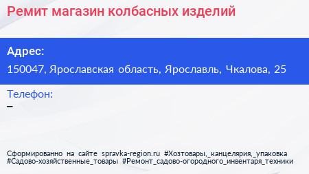 Ремит, магазин колбасных изделий по адресу 150047, Ярославская область, Ярославль, Чкалова, 25 в дальнейшем Организация, размещена в следующих категориях: