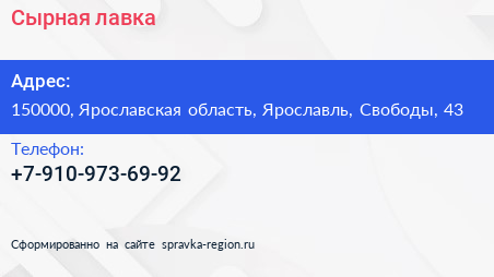 Сырная лавка по адресу 150000, Ярославская область, Ярославль, Свободы, 43 в дальнейшем Организация, размещена в следующих категориях: