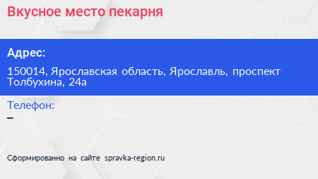 Вкусное место, пекарня по адресу 150014, Ярославская область, Ярославль, проспект Толбухина, 24а в дальнейшем Организация, размещена в следующих категориях: