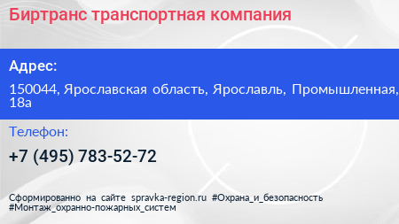Биртранс, транспортная компания по адресу 150044, Ярославская область, Ярославль, Промышленная, 18а в дальнейшем Организация, размещена в следующих категориях: