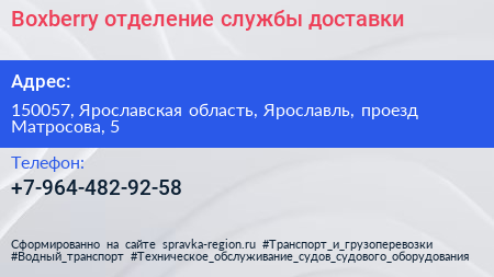 Boxberry, отделение службы доставки по адресу 150057, Ярославская область, Ярославль, проезд Матросова, 5 в дальнейшем Организация, размещена в следующих категориях: