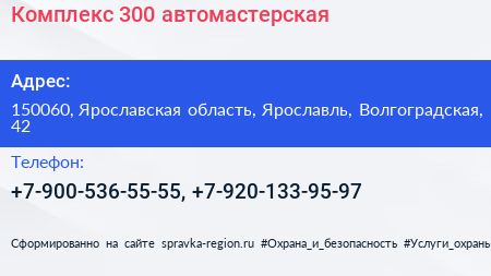 Комплекс 300, автомастерская по адресу 150060, Ярославская область, Ярославль, Волгоградская, 42 в дальнейшем Организация, размещена в следующих категориях: