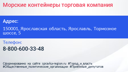Морские контейнеры, торговая компания по адресу 150001, Ярославская область, Ярославль, Тормозное шоссе, 5 в дальнейшем Организация, размещена в следующих категориях: