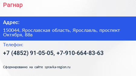 Рагнар по адресу 150044, Ярославская область, Ярославль, проспект Октября, 88в в дальнейшем Организация, размещена в следующих категориях: